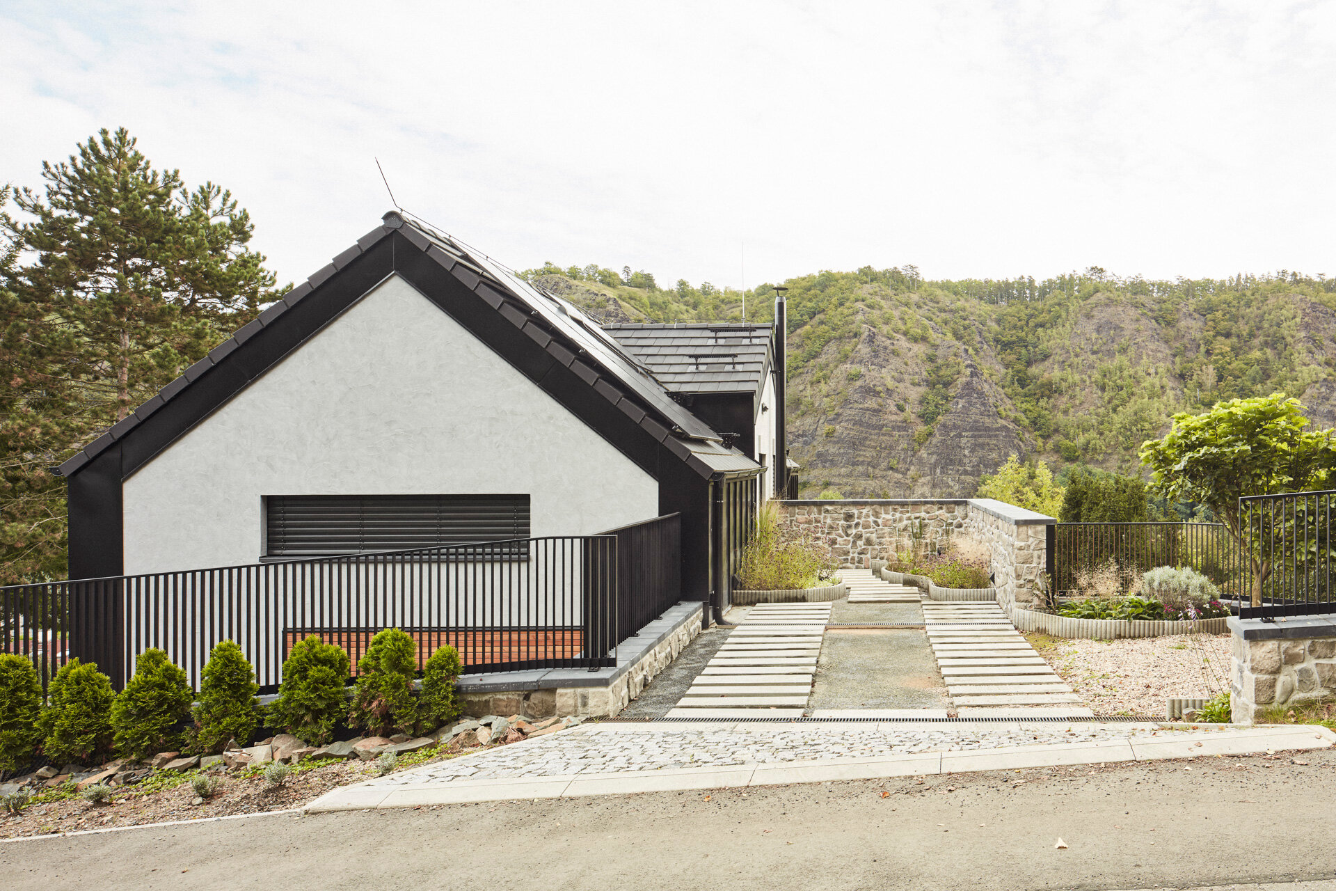 Pro moderní novostavbu nad údolím Vltavy jsme navrhli a zhotovili zábradlí, vchodové branky a oplocení pozemku v minimalistickém designu. Jednotný styl se propisuje do interiéru i exteriéru rodinného domu. Při pohledu z ulice pracujeme s efektem částečné neprůhlednosti. Z interiéru a terasy naopak stejný design zábradlí umožňuje nerušený výhled do krajiny. Veškeré prvky jsou zhotoveny z nerezové oceli s barevnou povrchovou úpravou. Materiál tak zajišťuje velmi dlouhou životnost.