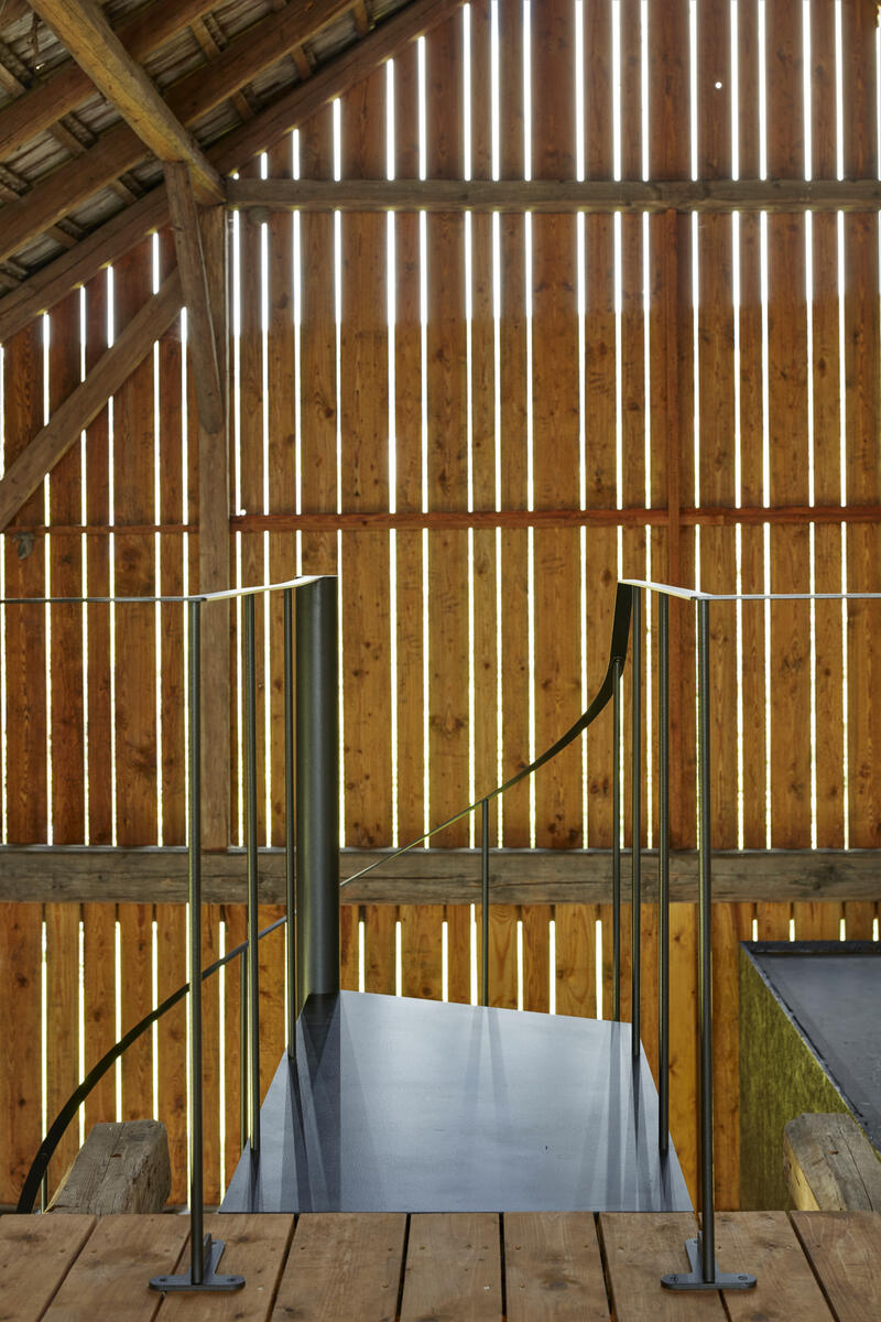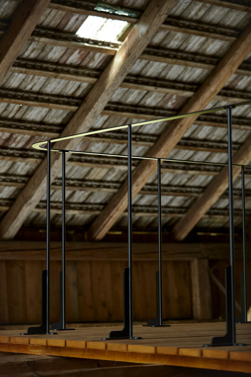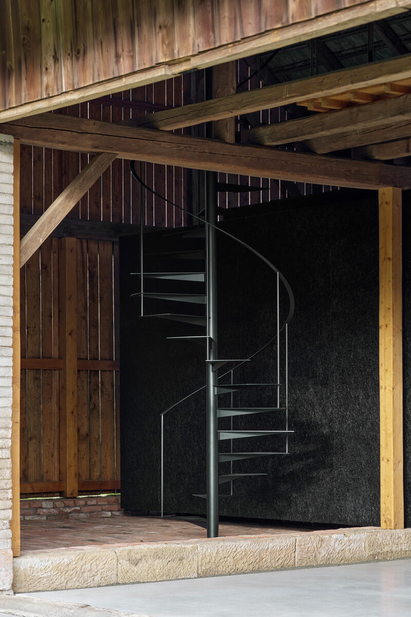 FACHA architekti navrhli malou jednotku pro sezonní pobyt vestavěnou do stodoly u venkovské usedlosti. Pro tento projekt jsme zhotovili ocelové vřetenové schodiště bez patrných svárů a šroubových spojů. Podlažní podesta schodiště plynule navazuje na vnitřní dřevěnou terasu, která je osazena zábradlím. Vrata stodoly jsme doplnili zástrčemi, které slouží k zabezpečení jednotlivých křídel.