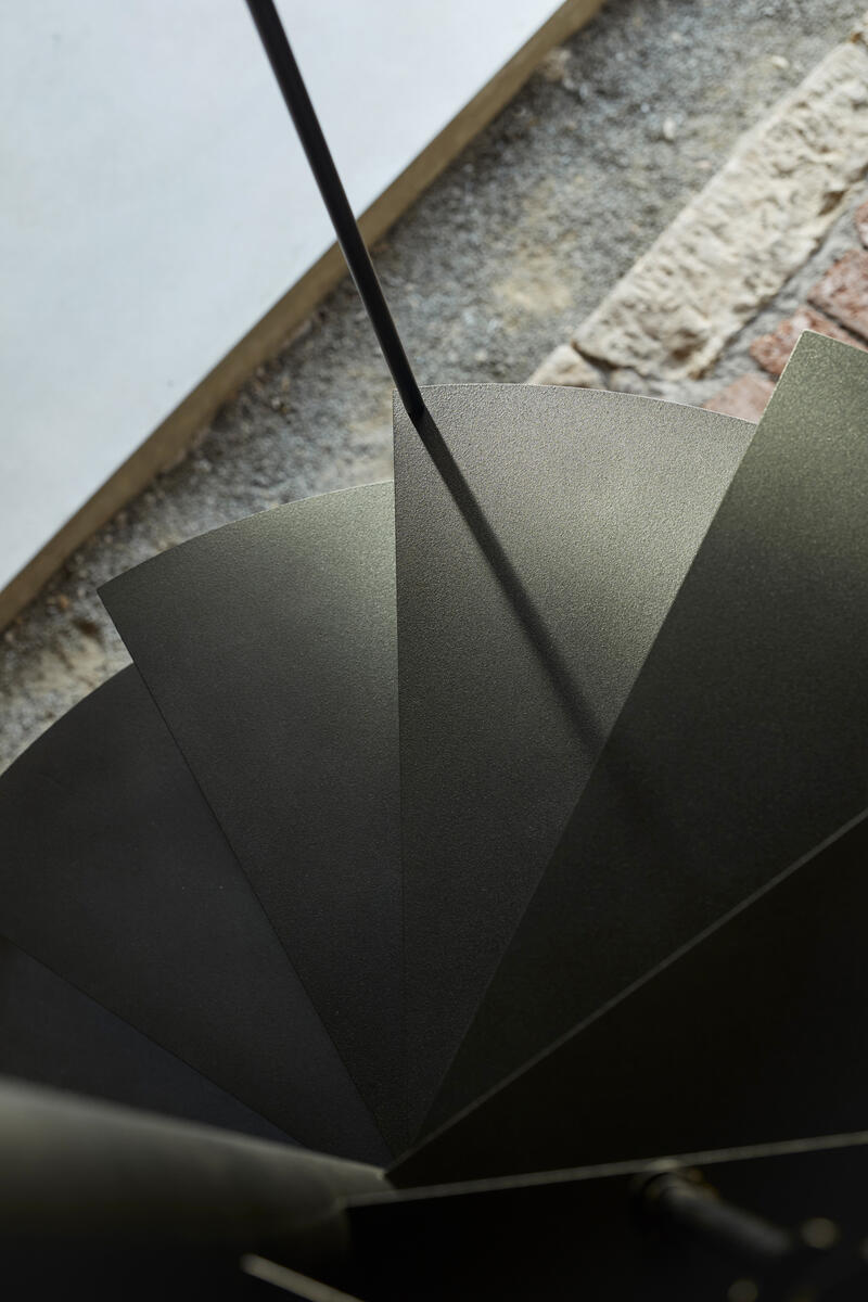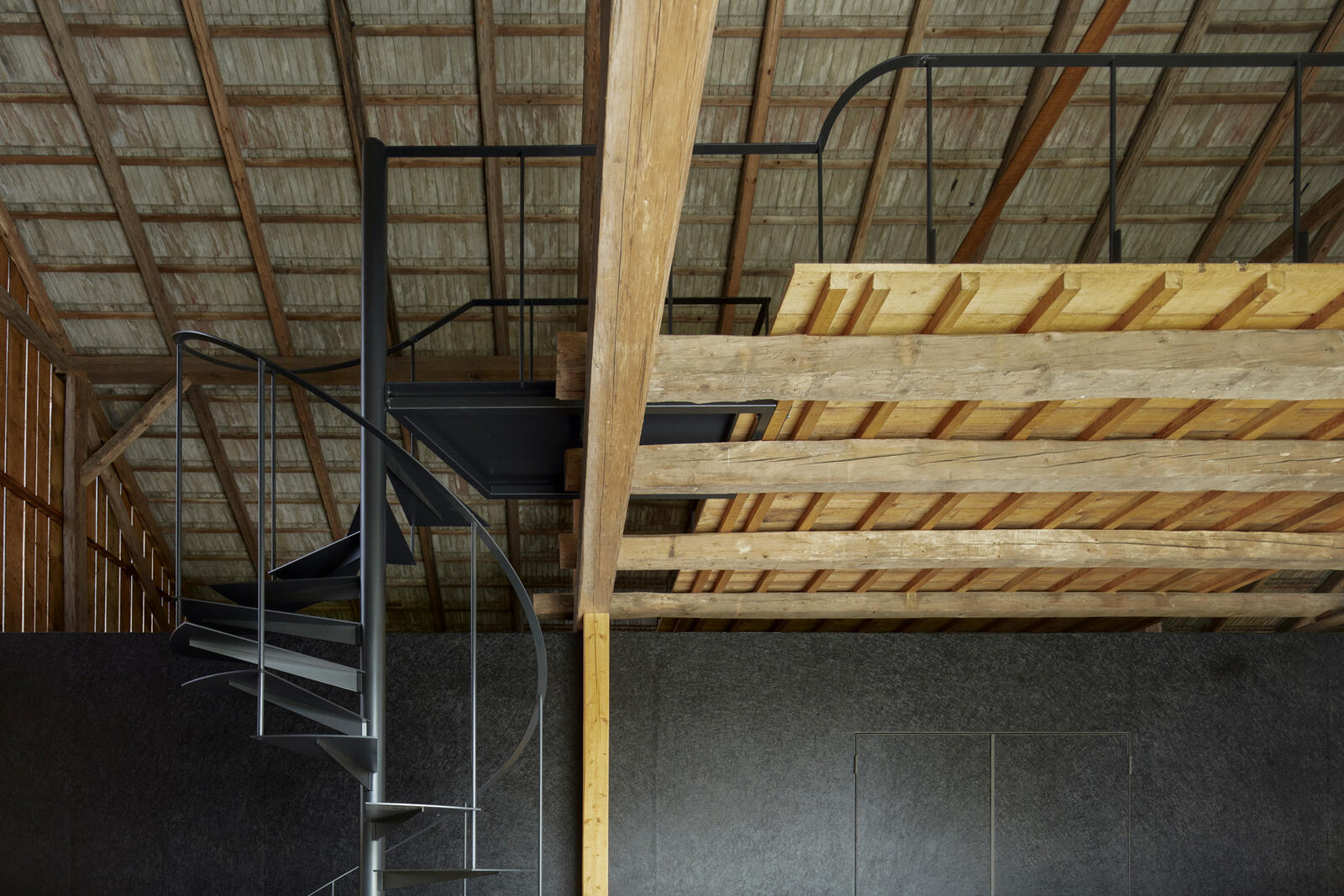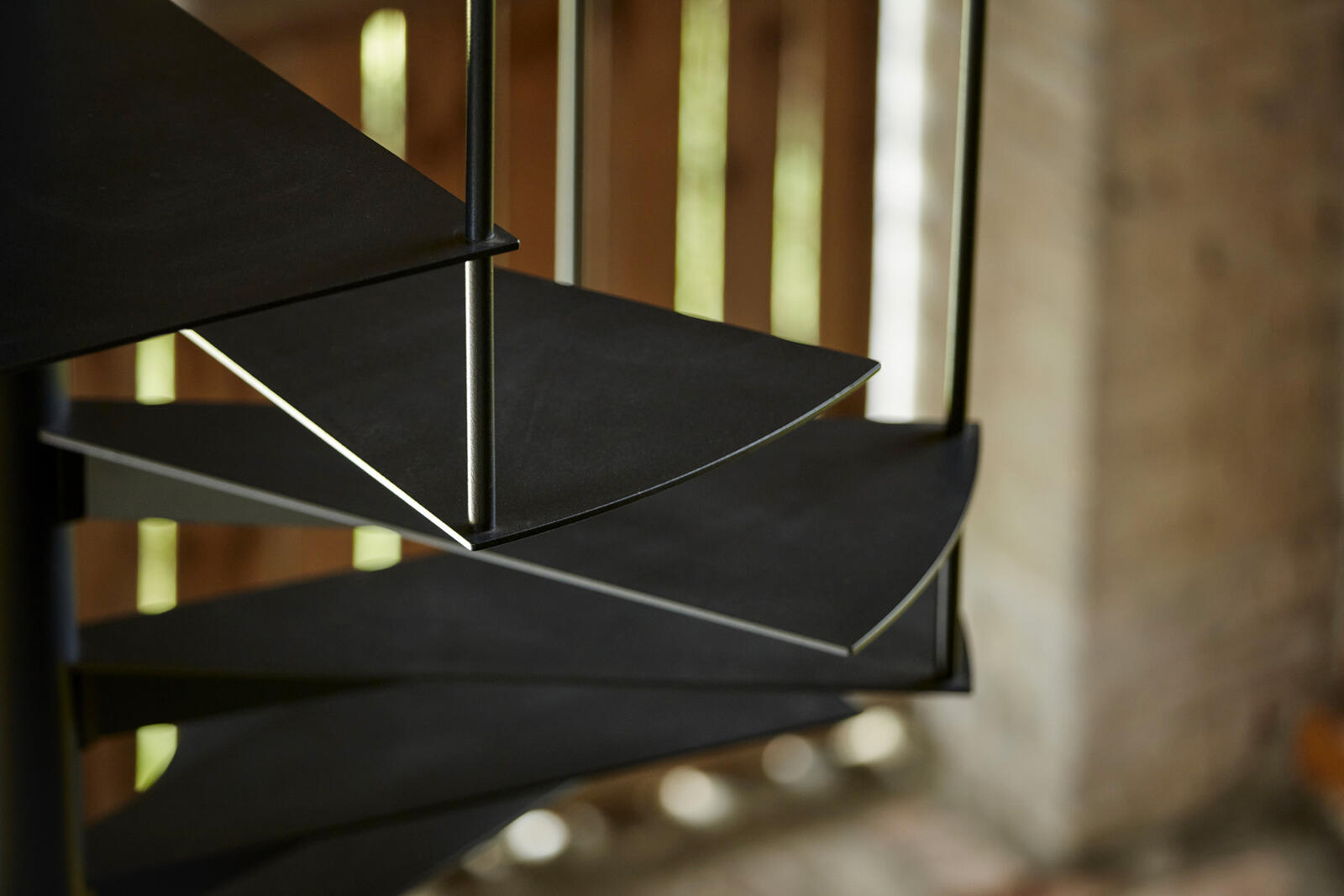 FACHA architekti navrhli malou jednotku pro sezonní pobyt vestavěnou do stodoly u venkovské usedlosti. Pro tento projekt jsme zhotovili ocelové vřetenové schodiště bez patrných svárů a šroubových spojů. Podlažní podesta schodiště plynule navazuje na vnitřní dřevěnou terasu, která je osazena zábradlím. Vrata stodoly jsme doplnili zástrčemi, které slouží k zabezpečení jednotlivých křídel.